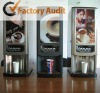 Fashionable design d easy operationAdopting the latest science and technology and with European style. Micro control made use easy. The display of LED mode helps to know the situation of the machine and use it conveniently.Adjusting the taste freelyYou can adjust the taste freely according to your flavor.The choices of automatic cup falls and using your own cupsYou can choose to use standard paper cups or your own cups, which is convenience and environ mental protection. The capacity of paper cups holder is eighty cups.Sales calculation and setting the unit priceThe system of micro control can set each drinks unit price separately, and calculate each sales quantity automatically.The system of recognizer of many countries coinThis machine is adopted the recognizer of special coin or more sensitive recognizer depending on the customers demand. This system could recognize the coins of different sizes which satisfied the markets demand in different countries or districts.The design makes the cleaning easier because its easy to dismantleThe mixers and the connecting pipe of fan are easy to dismantle and clean.Large capacityYou can use the raw material buckets of different sizes thats the max capacity is 2800g to avoid the bother of feeding material frequently.Using the purified water tank of 18.9LPlacing the purified water tank of 18.9L (9 gallons) on the top of the machine to avoid feeding the water frequently.Digital temperature controlYou can adjust the temperature from 68 to 98 following the seasons changed.Patent design and mixersThe former coffee machine had mixed incompletely, but the new design solves this problem thoroughly and makes many bubbles, which gives you better taste. Usagerange: All kind of schoolsTeaching building, student hotel, reading room Student canteen, grocery store, etcOffice buildingsOffice building, bank, hospital, staff rest area , etcChain shopSuper market, snack bar, subway station, railway station, airport, beauty salon, etcRestaurant and hotelLounge, guest room, etcLeisure and Entertainment placeKTV, internet bar, cinema, etc